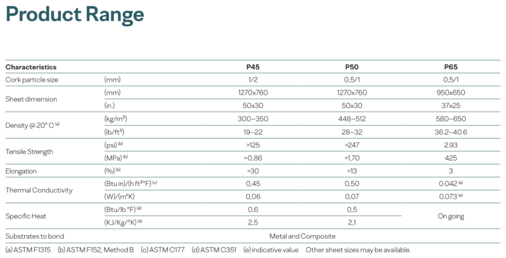 The highest-density Amorim aerospace cork grade — engineered for structural sealing and applications requiring maximum load-bearing capability. Smaller sheet format (37″ × 25″). Thermal conductivity and specific heat data are indicative values. Contact Coast-Line for specific heat testing status as characterization is ongoing.